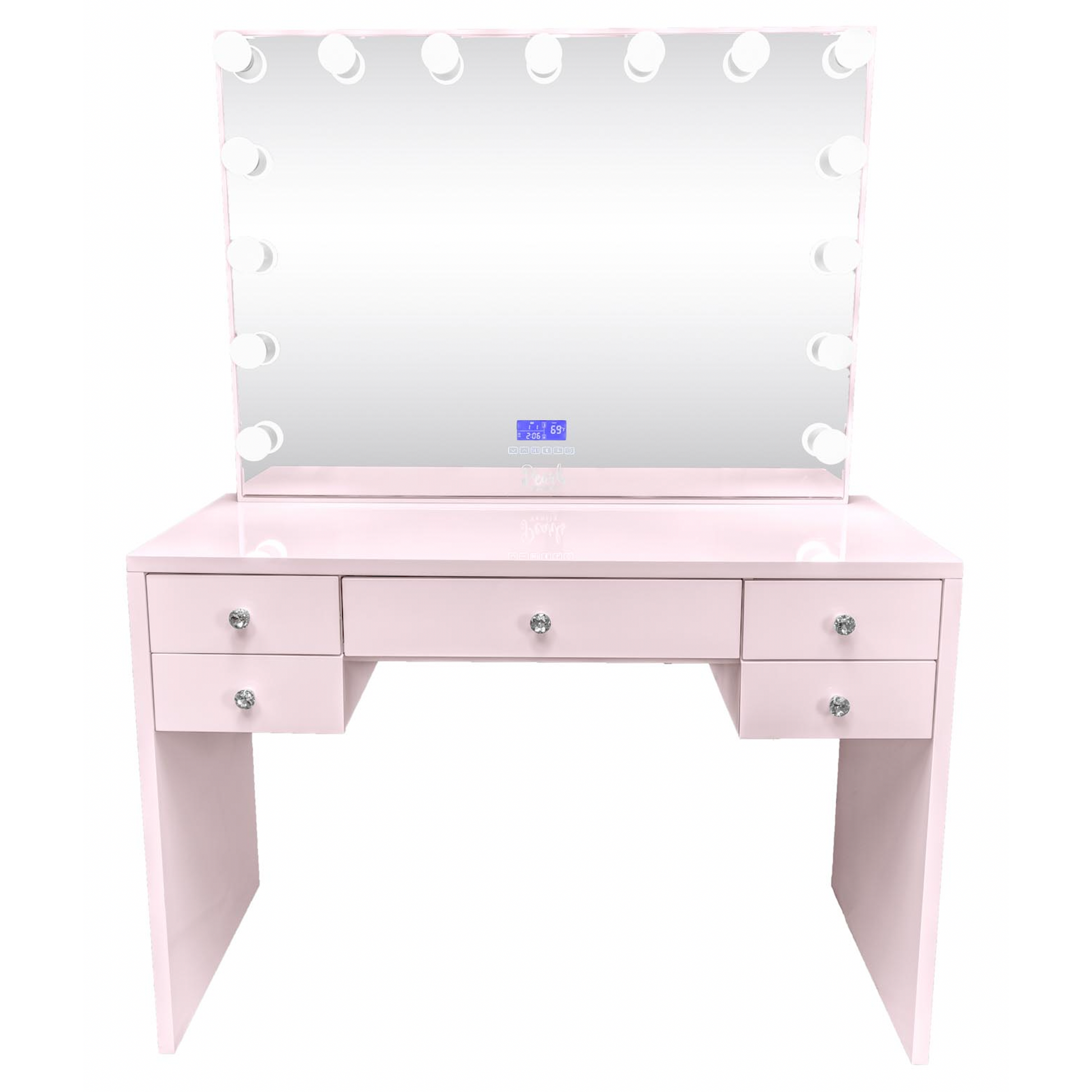 Experience a vanity made for both elegance and endurance. With a smooth, high-gloss finish & crystal knobs. Equipped with Bluetooth features and dimmable bulbs for lasting brilliance.