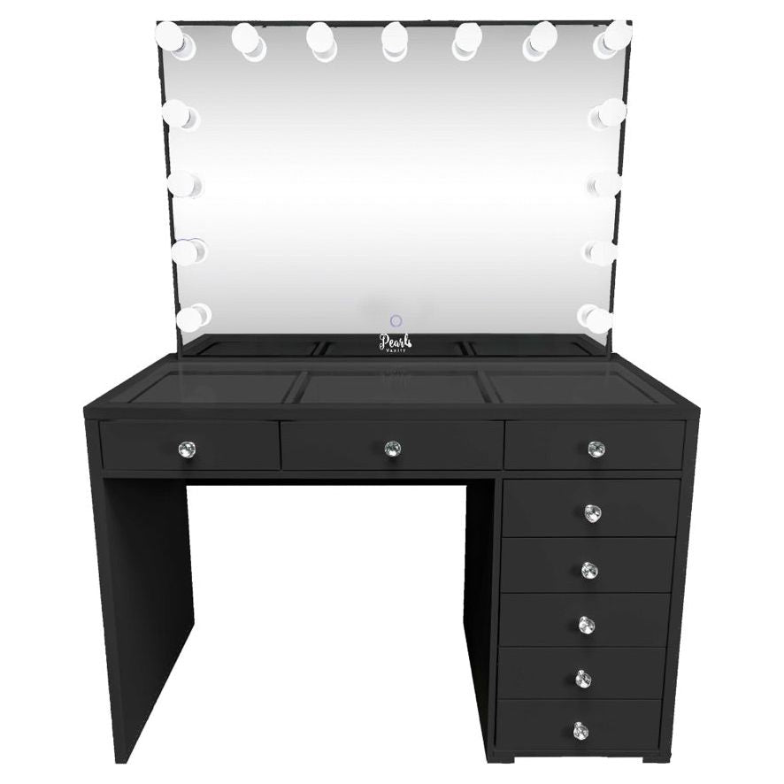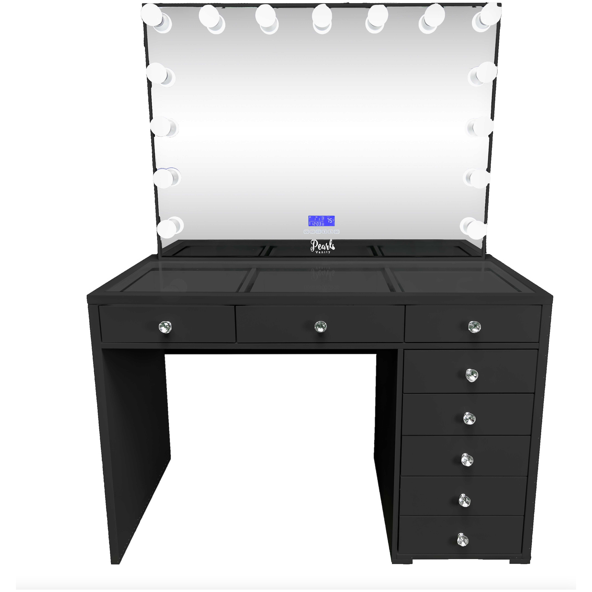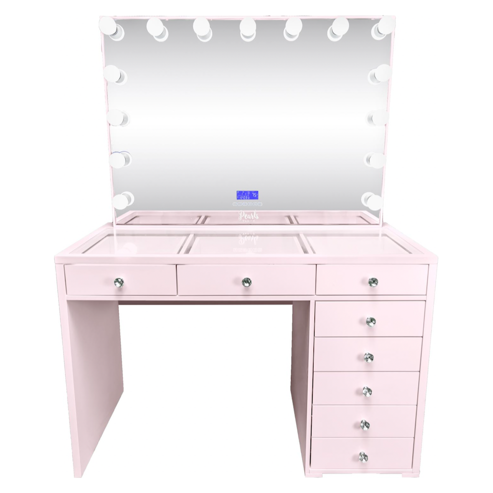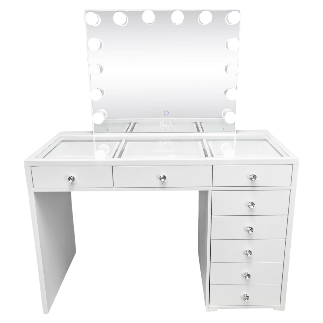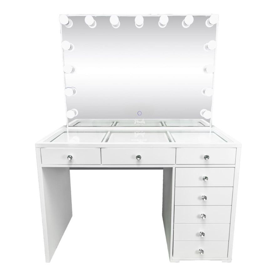 Experience a vanity made for both elegance and endurance. With a smooth, high-gloss finish & crystal knobs. Equipped with Bluetooth features and dimmable bulbs for lasting brilliance.