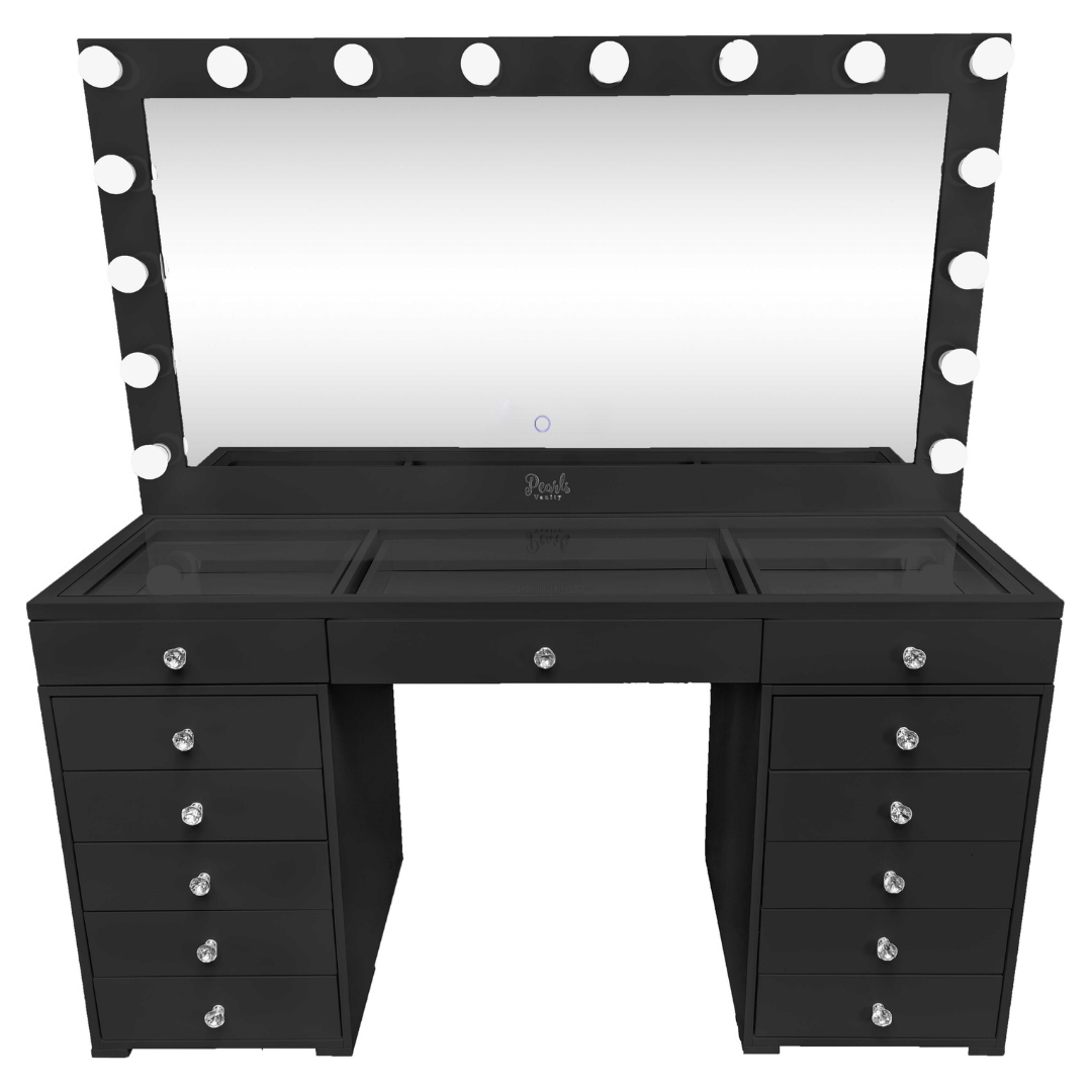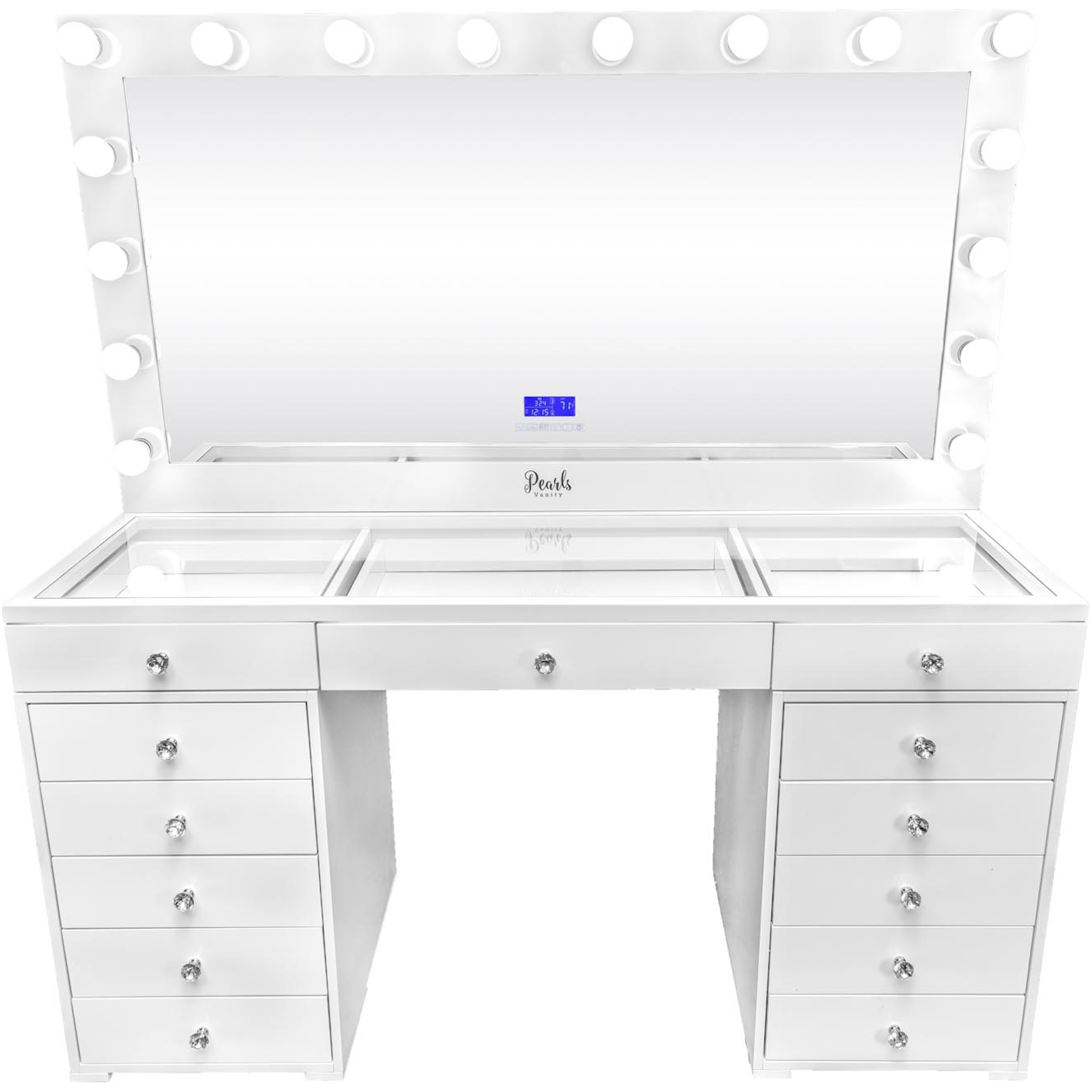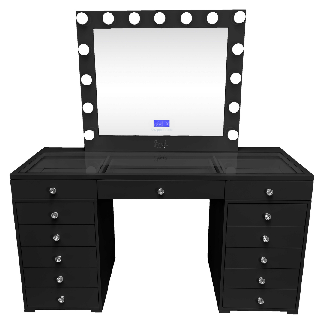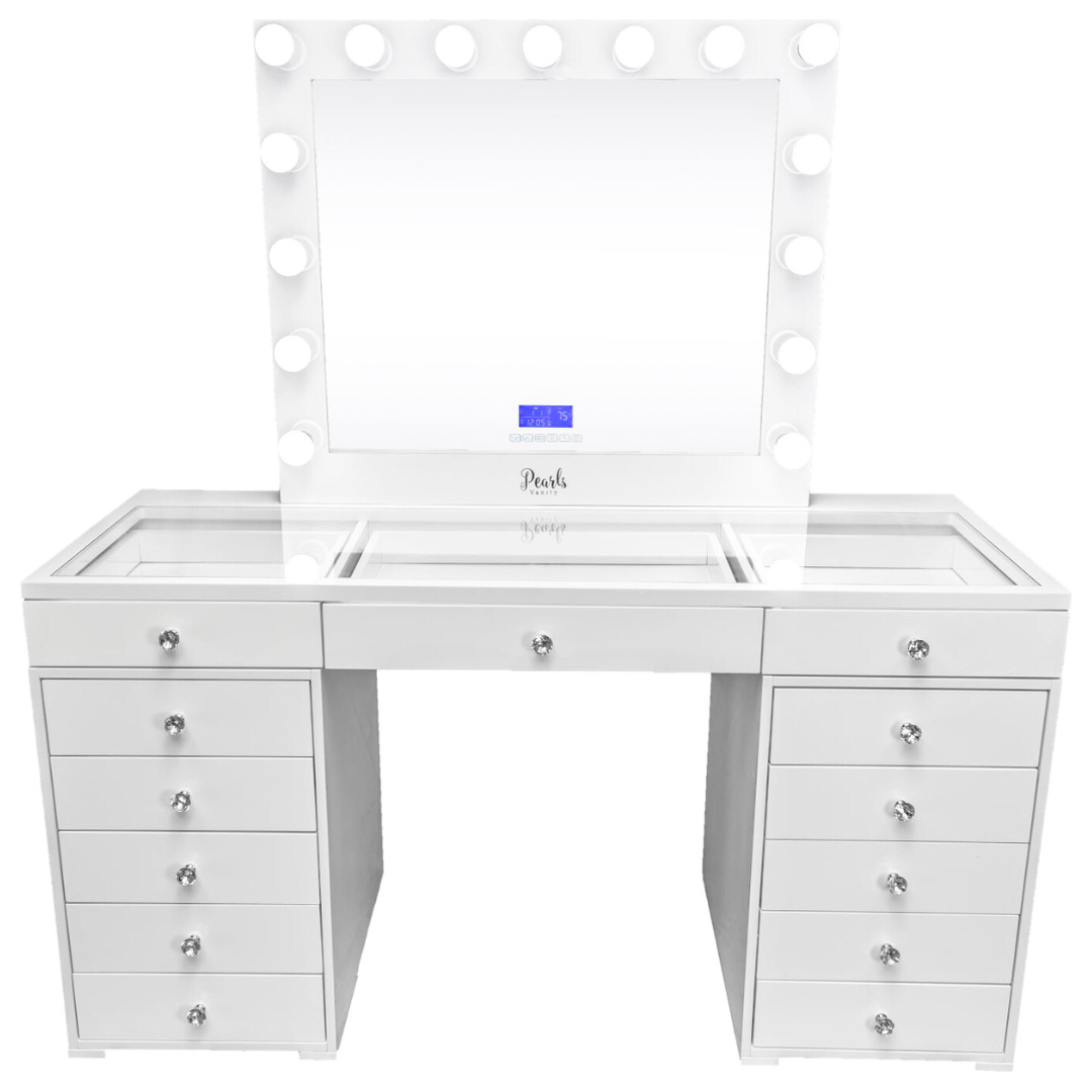 Experience a vanity made for both elegance and endurance. With a smooth, high-gloss finish & crystal knobs. Equipped with Bluetooth features and dimmable bulbs for lasting brilliance.