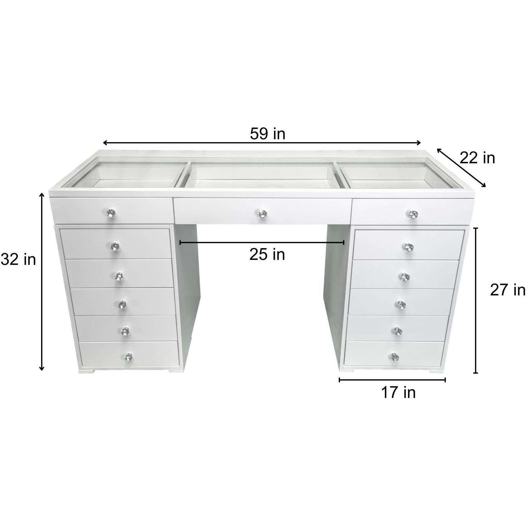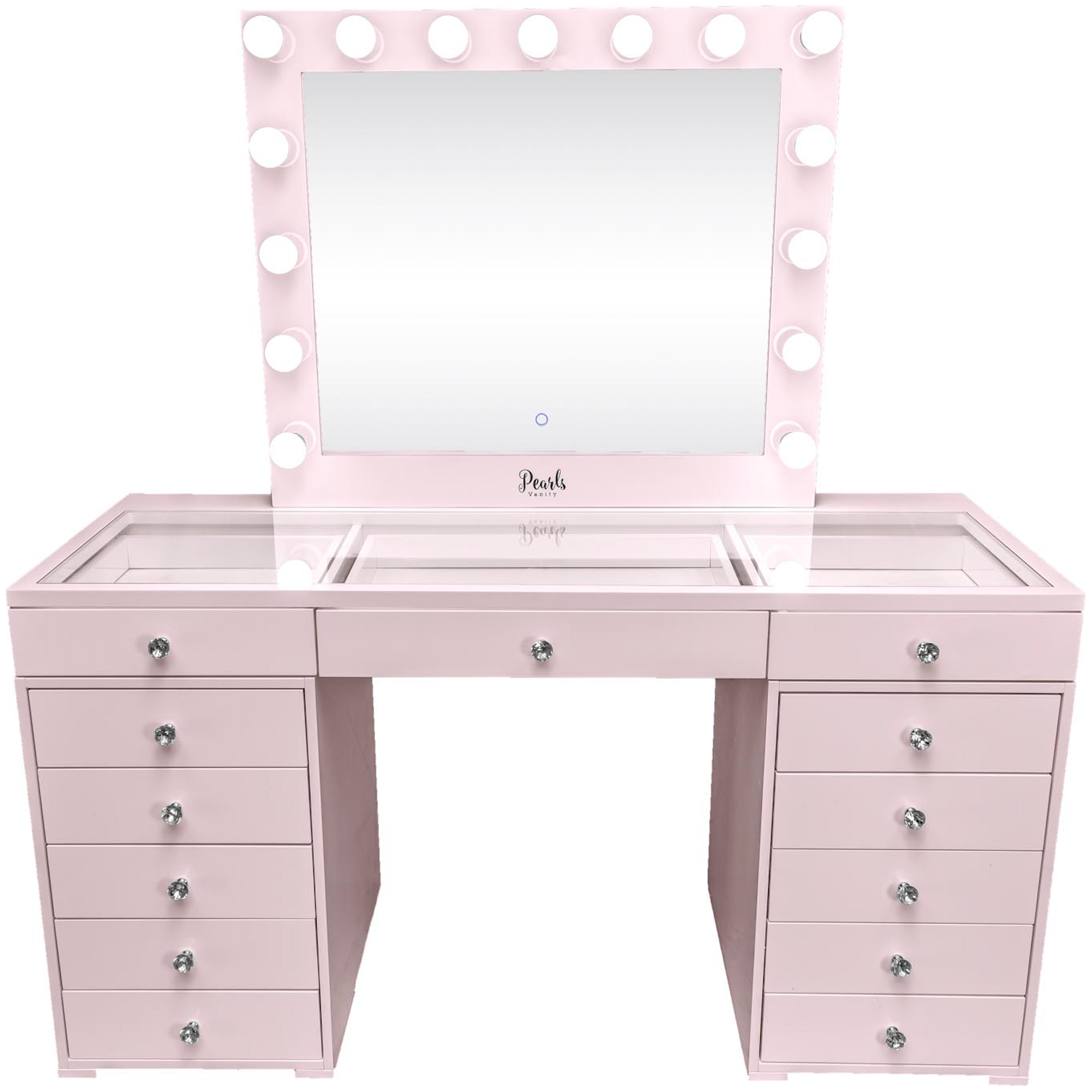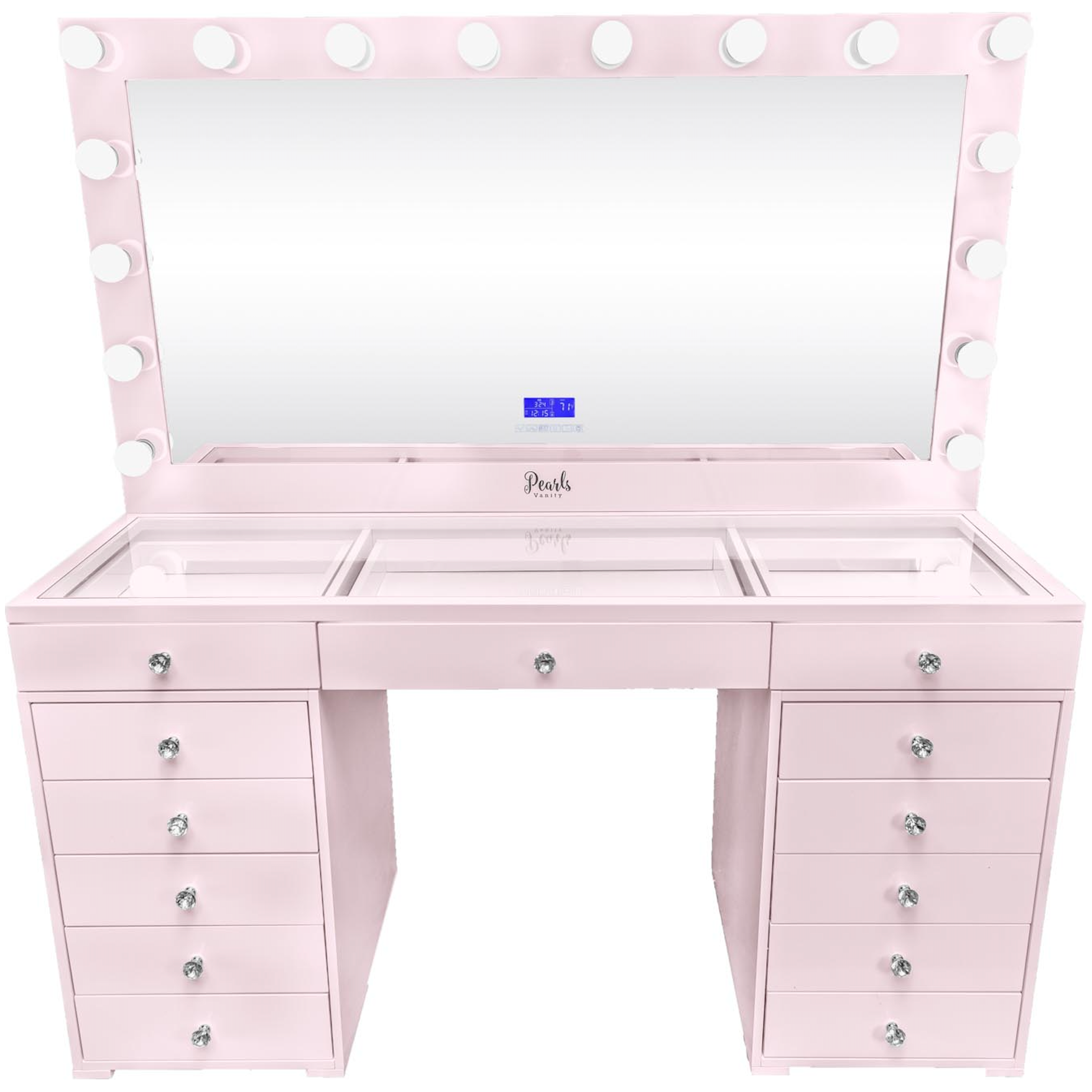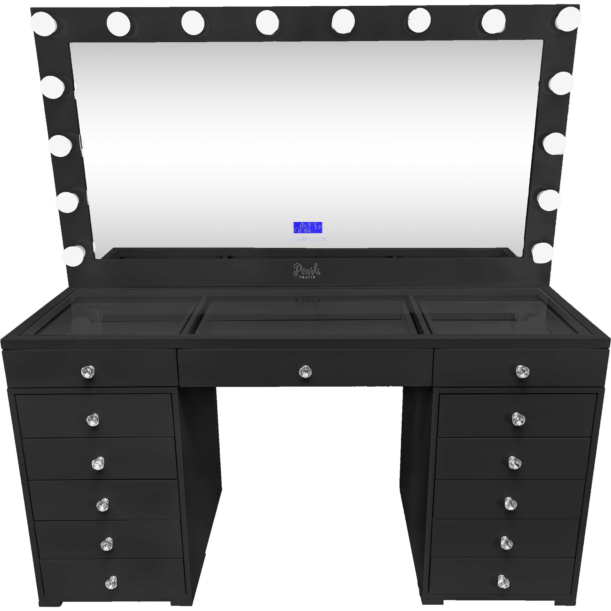 Experience a vanity made for both elegance and endurance. With a smooth, high-gloss finish & crystal knobs. Equipped with Bluetooth features and dimmable bulbs for lasting brilliance.