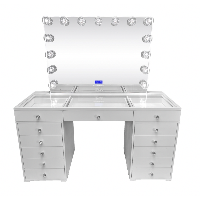 A best seller for a reason. Featuring a tempered glass top for easy visibility, 13 spacious drawers with crystal knobs, and a high-gloss finish for effortless elegance and easy cleaning.