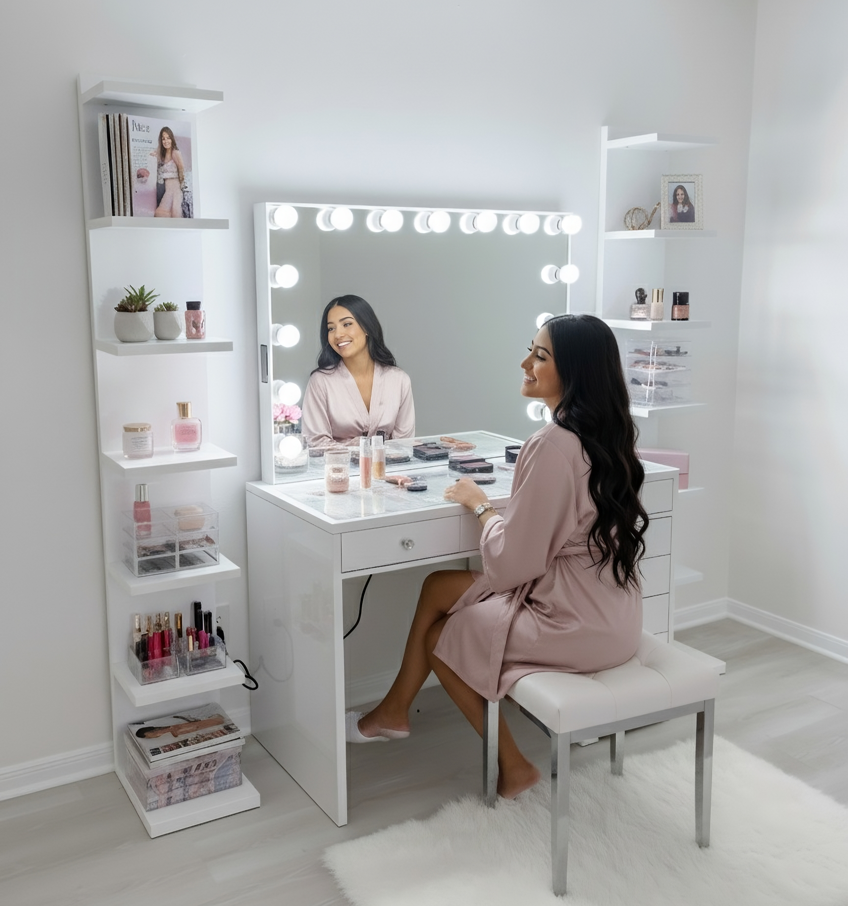 Experience a vanity made for both elegance and endurance. With a smooth, high-gloss finish & crystal knobs. Equipped with Bluetooth features and dimmable bulbs for lasting brilliance.