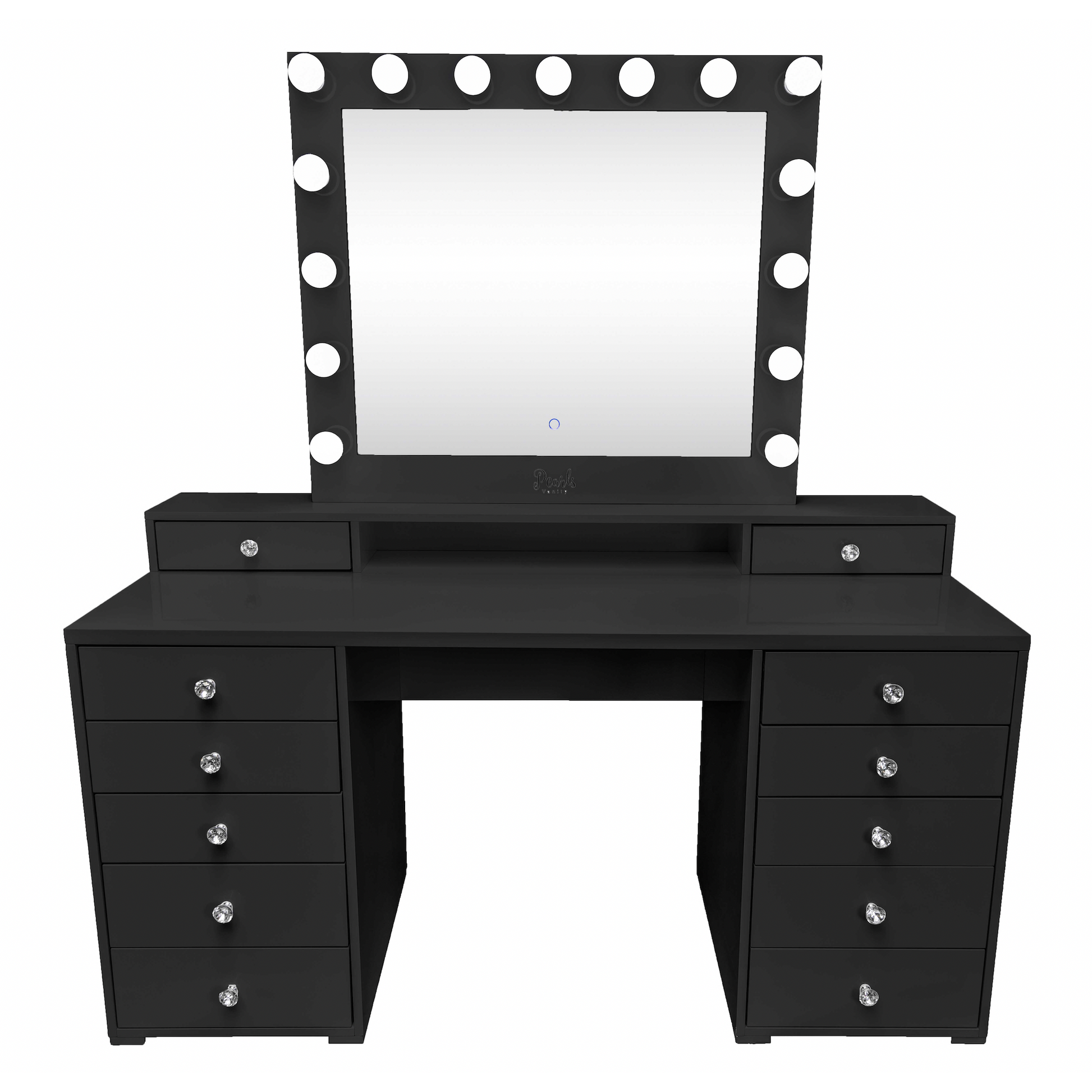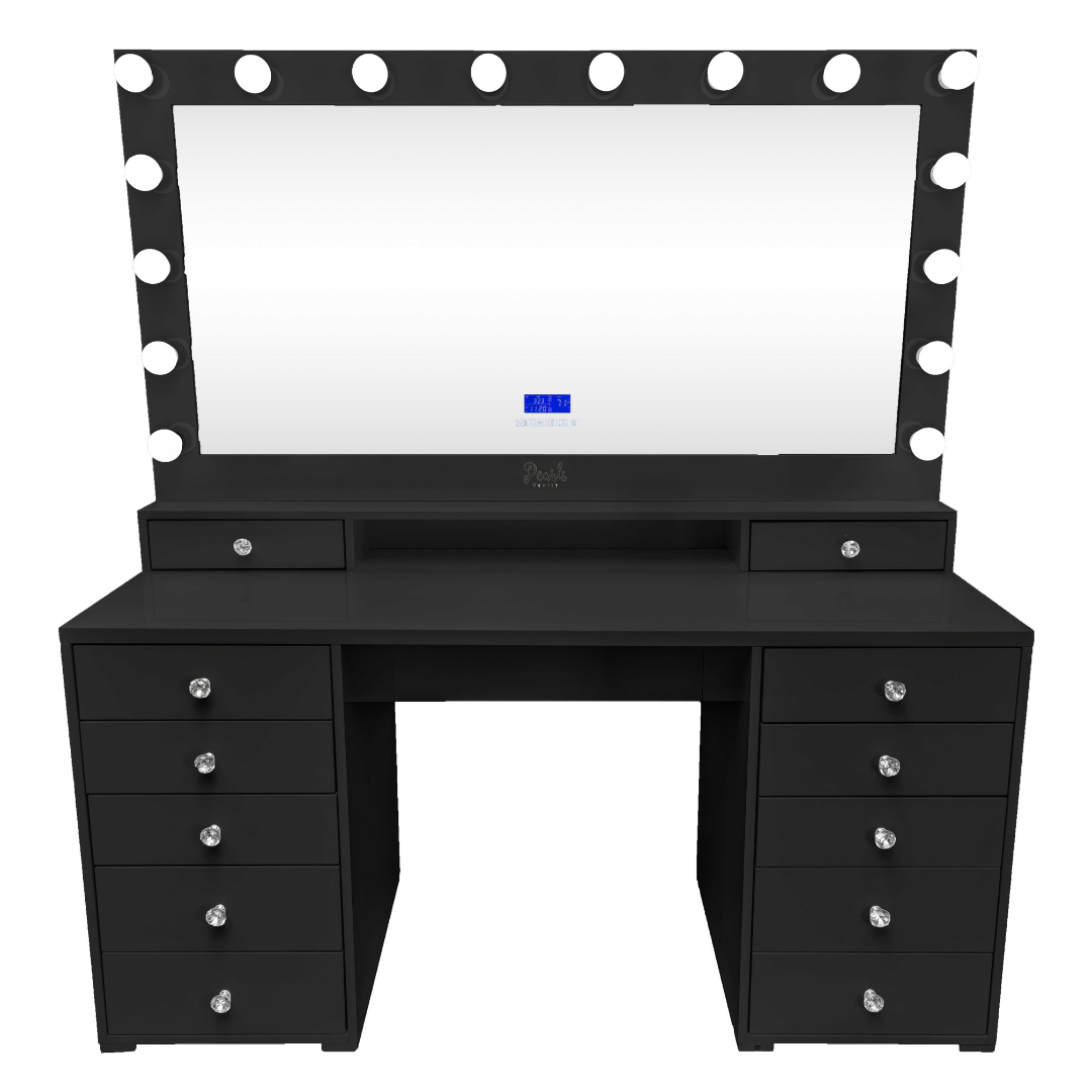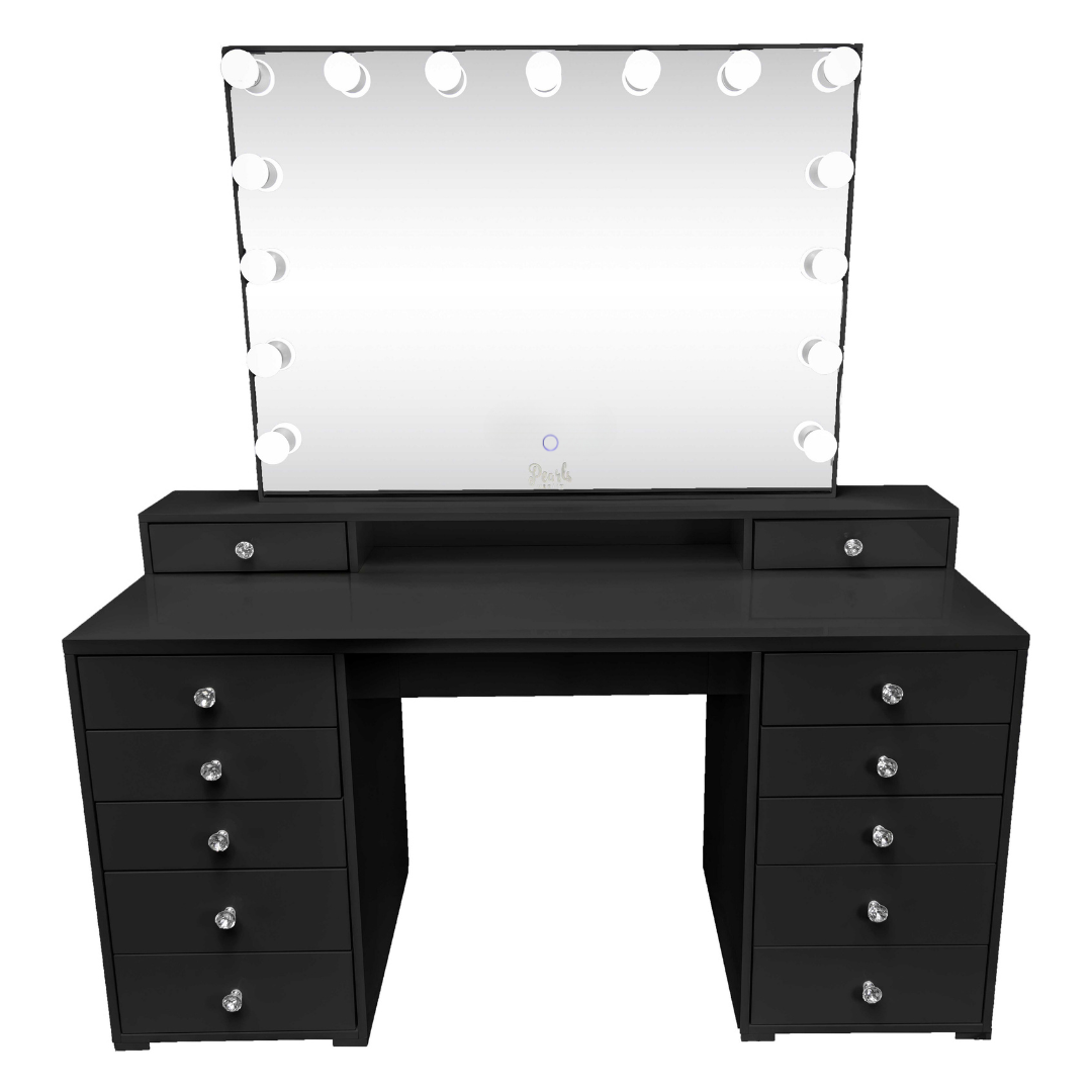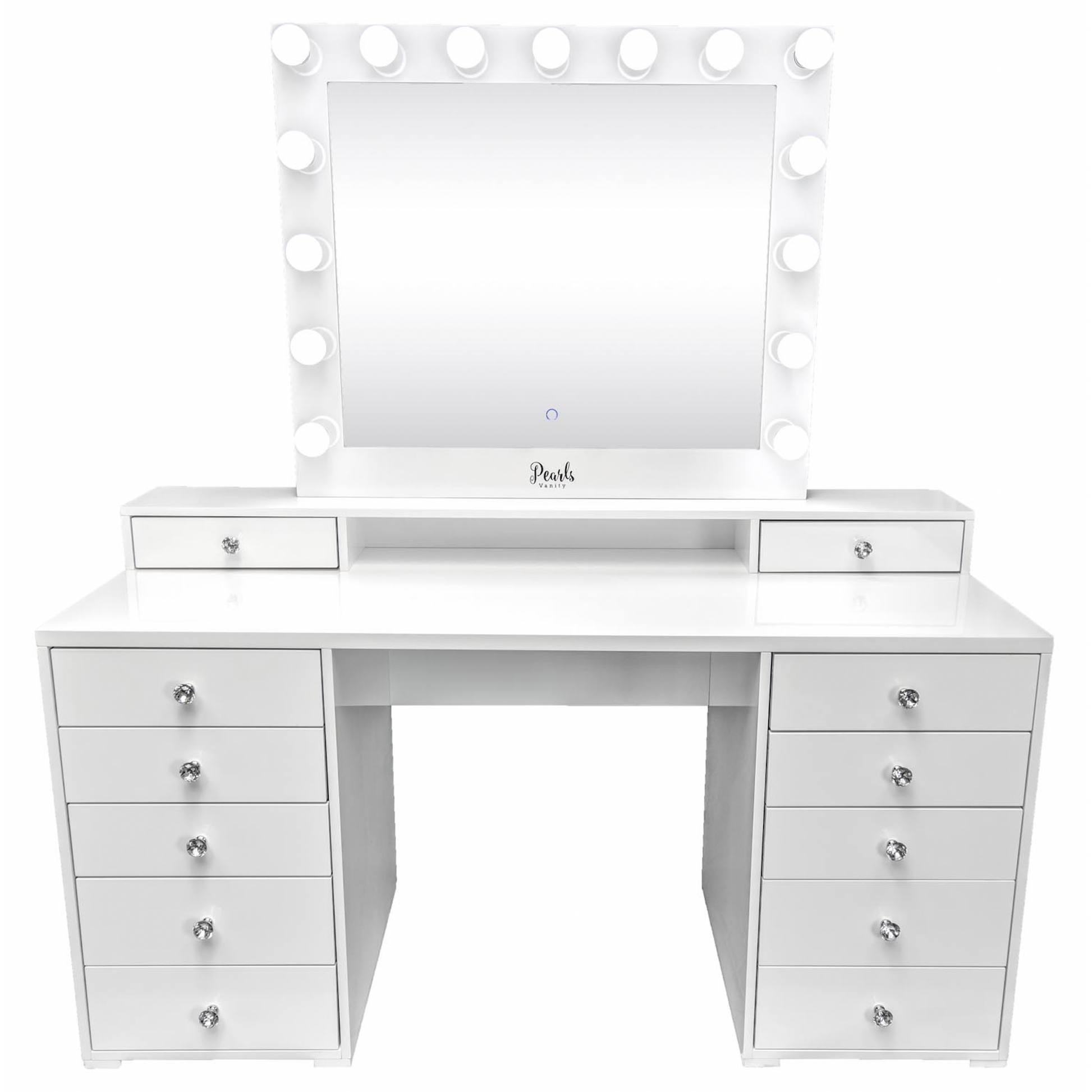 This one of a kind, lovely vanity brings you a second layer frame that provides additional space for make up brushes or your favorite perfumes! Easily reach into your favorite items and keep them close to you, with its top two exclusive and adorable mini drawers. Give this vanity your own special touch with the free in-between space that was added exclusively for your ideas and originality. This solid wood top vanity grants a shiny sleek look with its high-gloss coated surface, allowing for an easier wipe-off process, while at the same time, providing a protective layer to the surface. Divine Vanity comes with great capacity for all your make up collection, Not to mention, the absolute touch of glamour the crystal knobs bring each of its 12 drawers. Sturdy and selective high quality materials, striving to keep your vanity looking beautiful for many years.