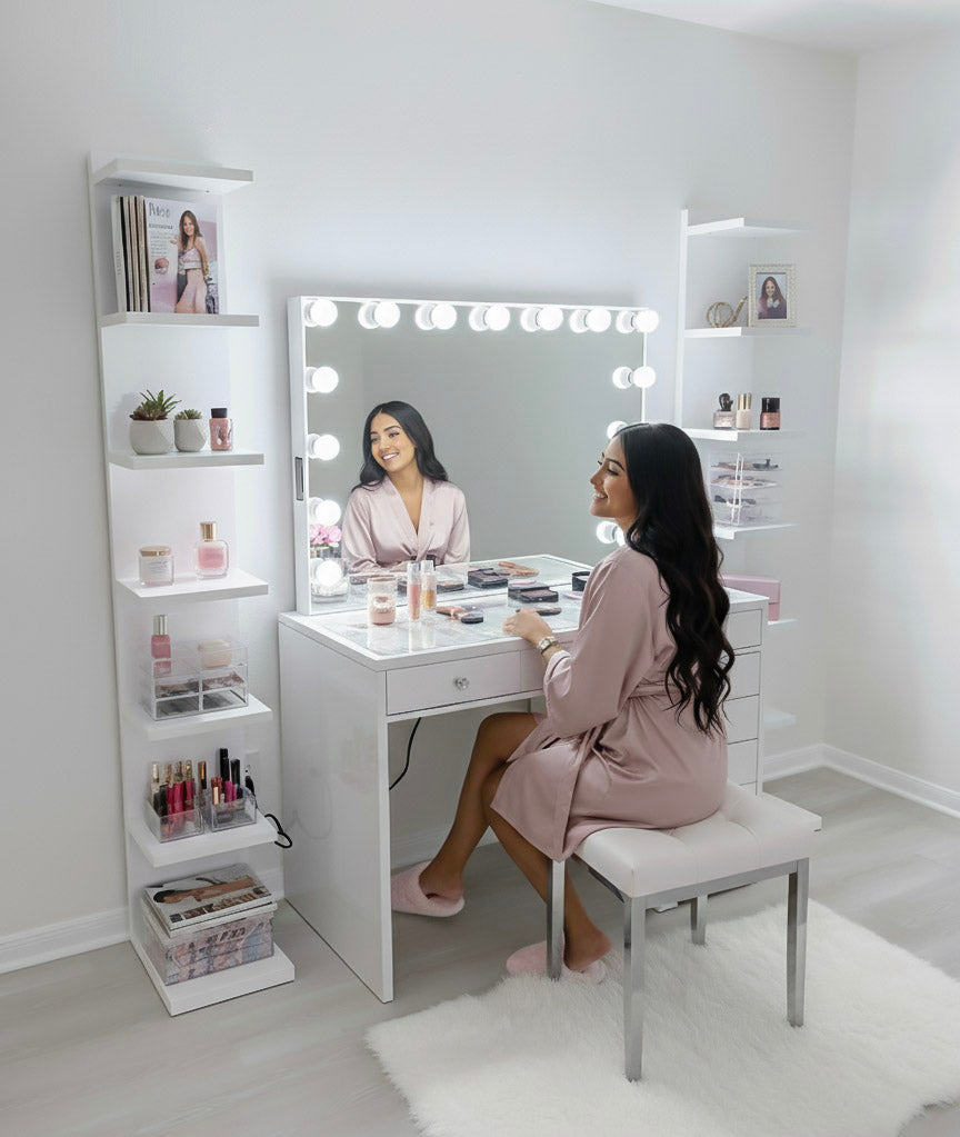 Experience a vanity made for both elegance and endurance. With a smooth, high-gloss finish & crystal knobs. Equipped with Bluetooth features and dimmable bulbs for lasting brilliance.