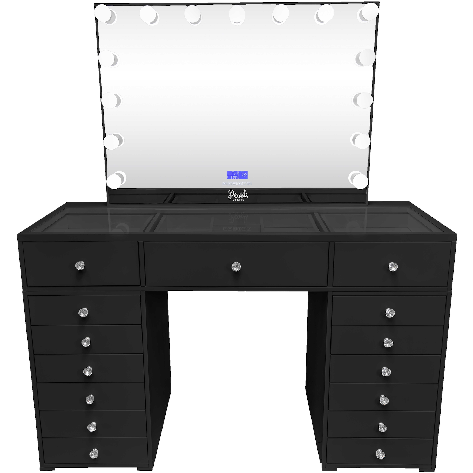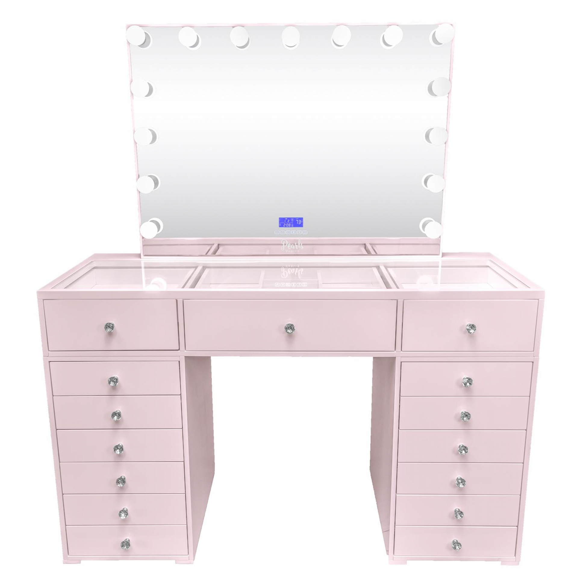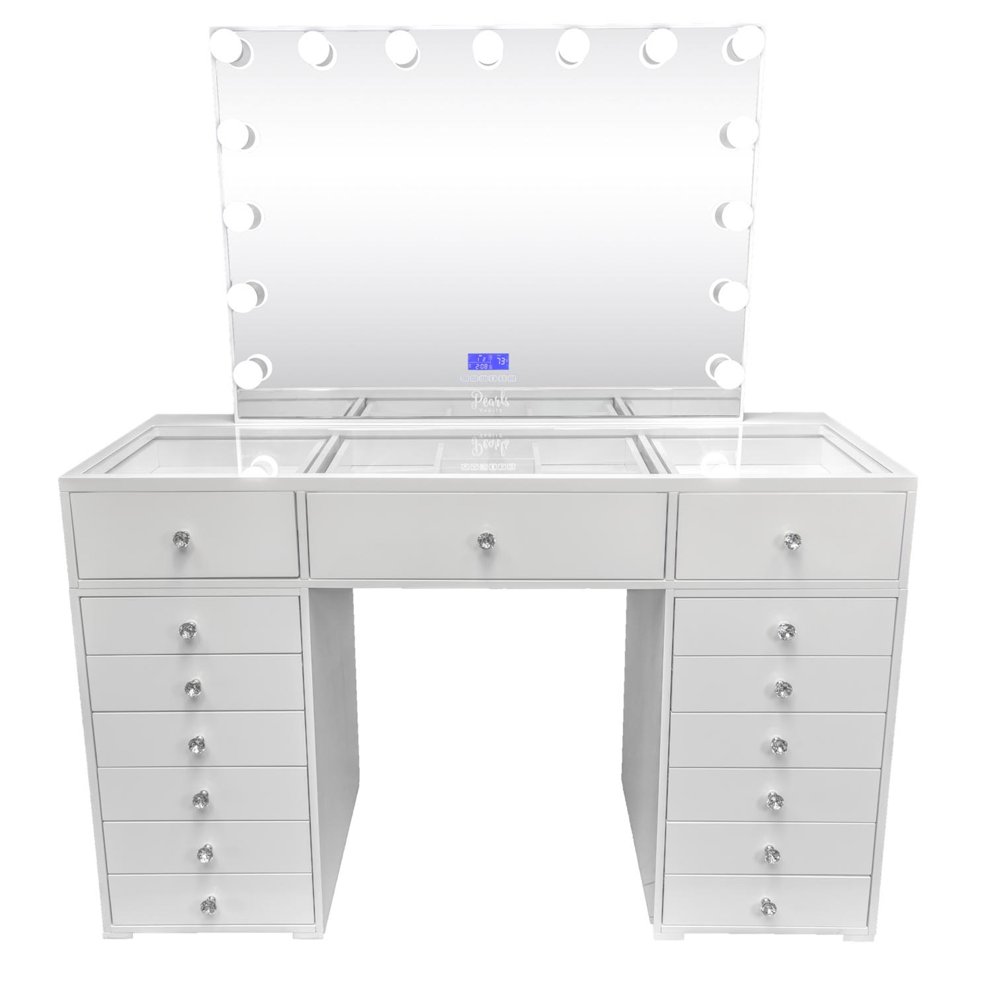 Experience a vanity made for both elegance and endurance. With a smooth, high-gloss finish & crystal knobs. Equipped with Bluetooth features and dimmable bulbs for lasting brilliance.