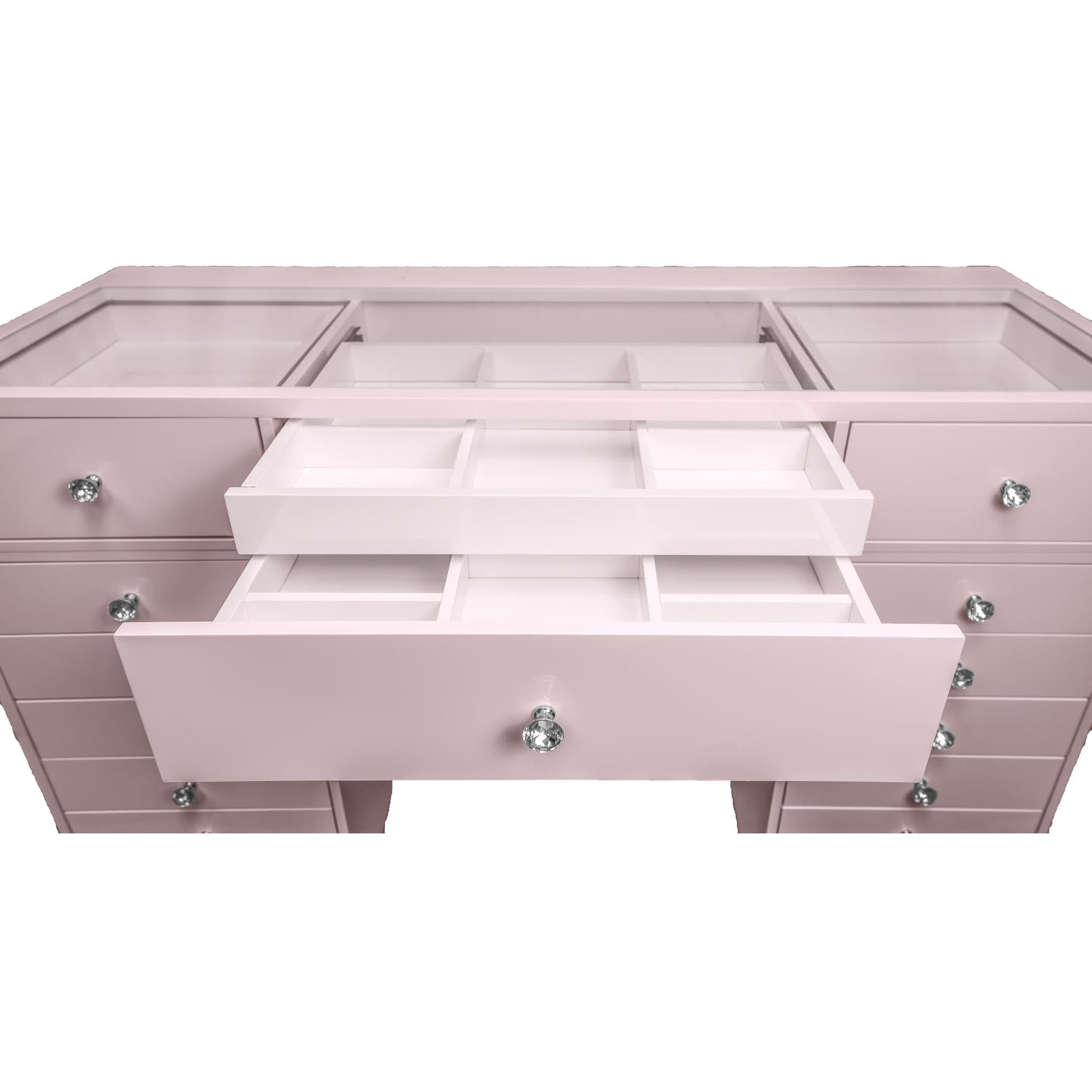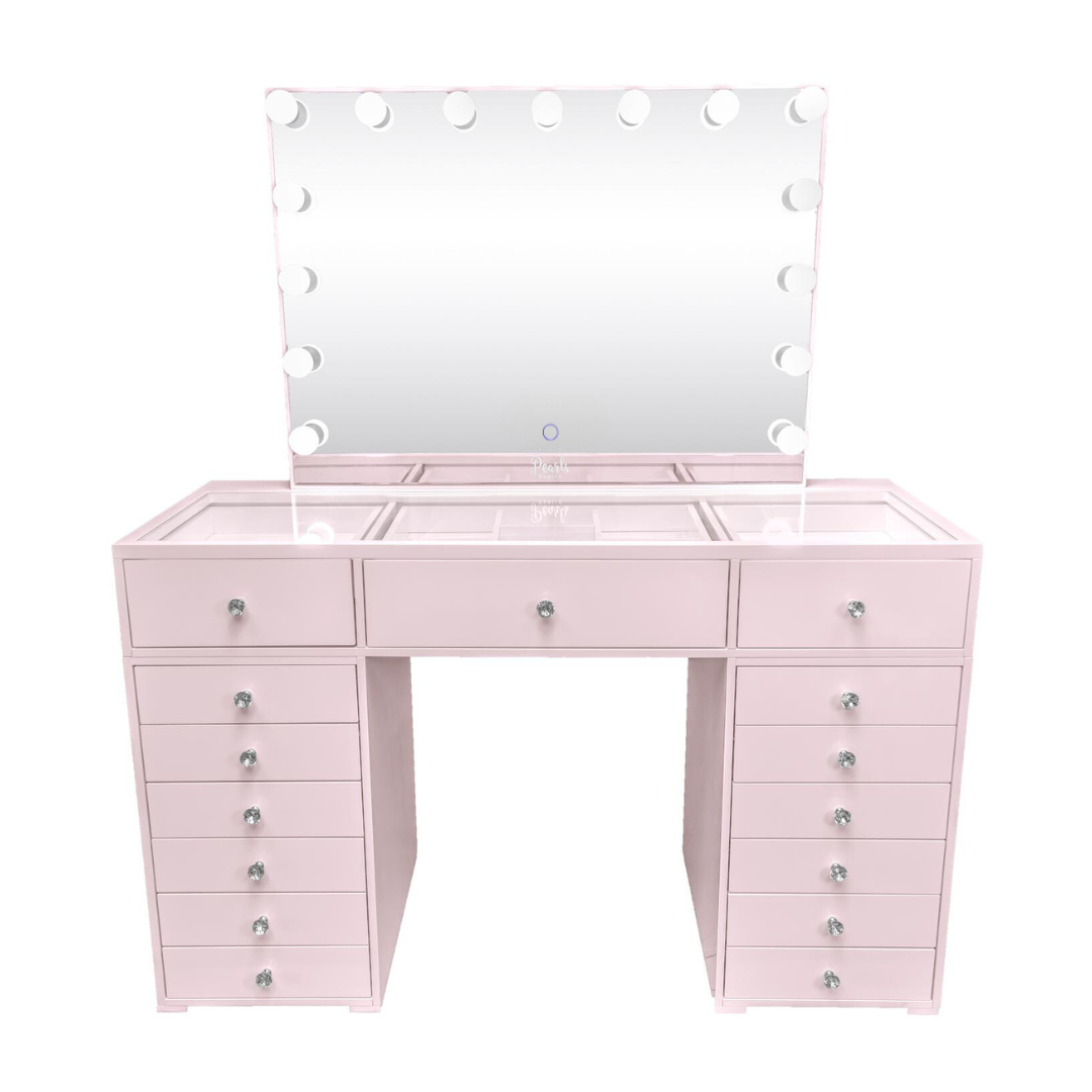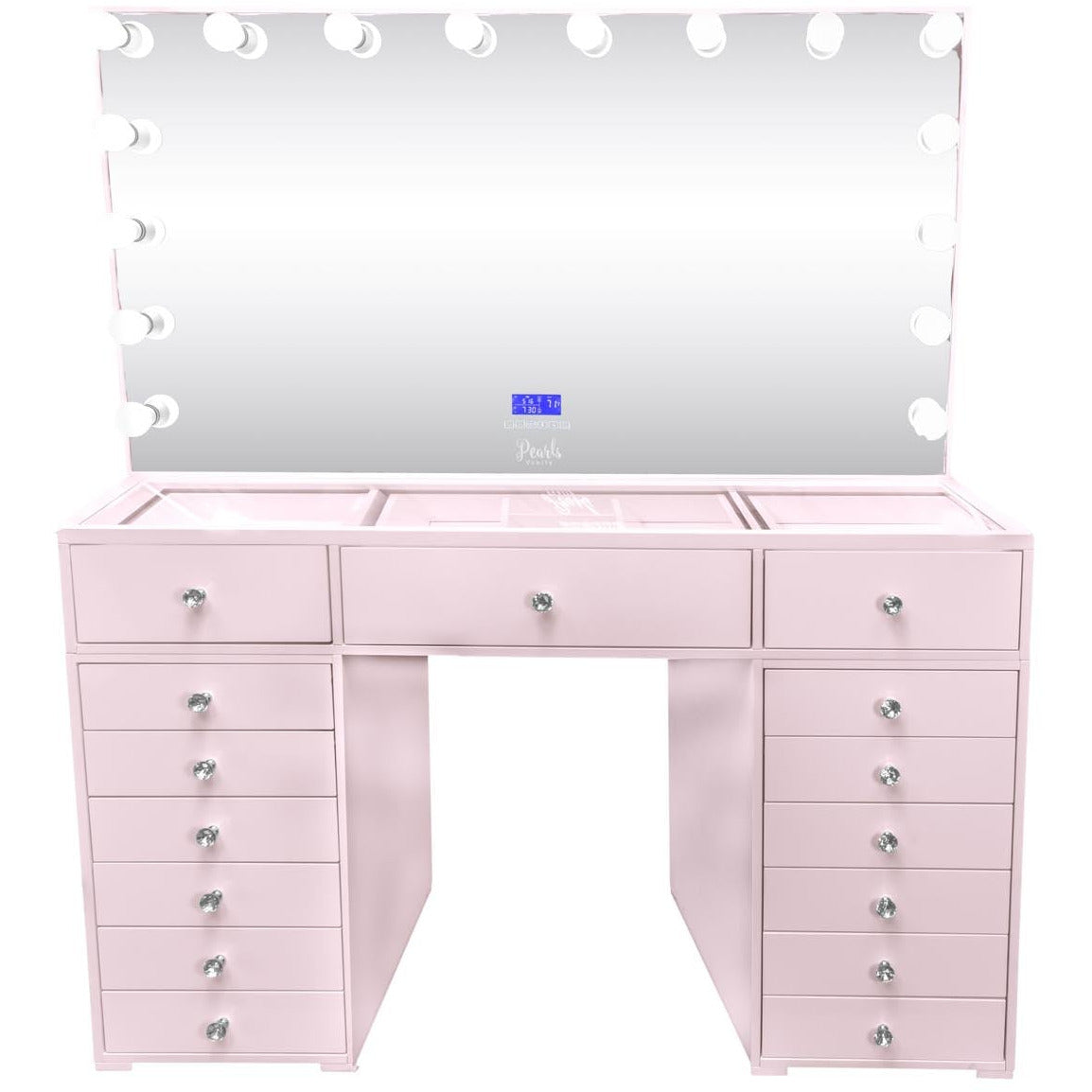 Experience a vanity made for both elegance and endurance. With a smooth, high-gloss finish & crystal knobs. Equipped with Bluetooth features and dimmable bulbs for lasting brilliance.