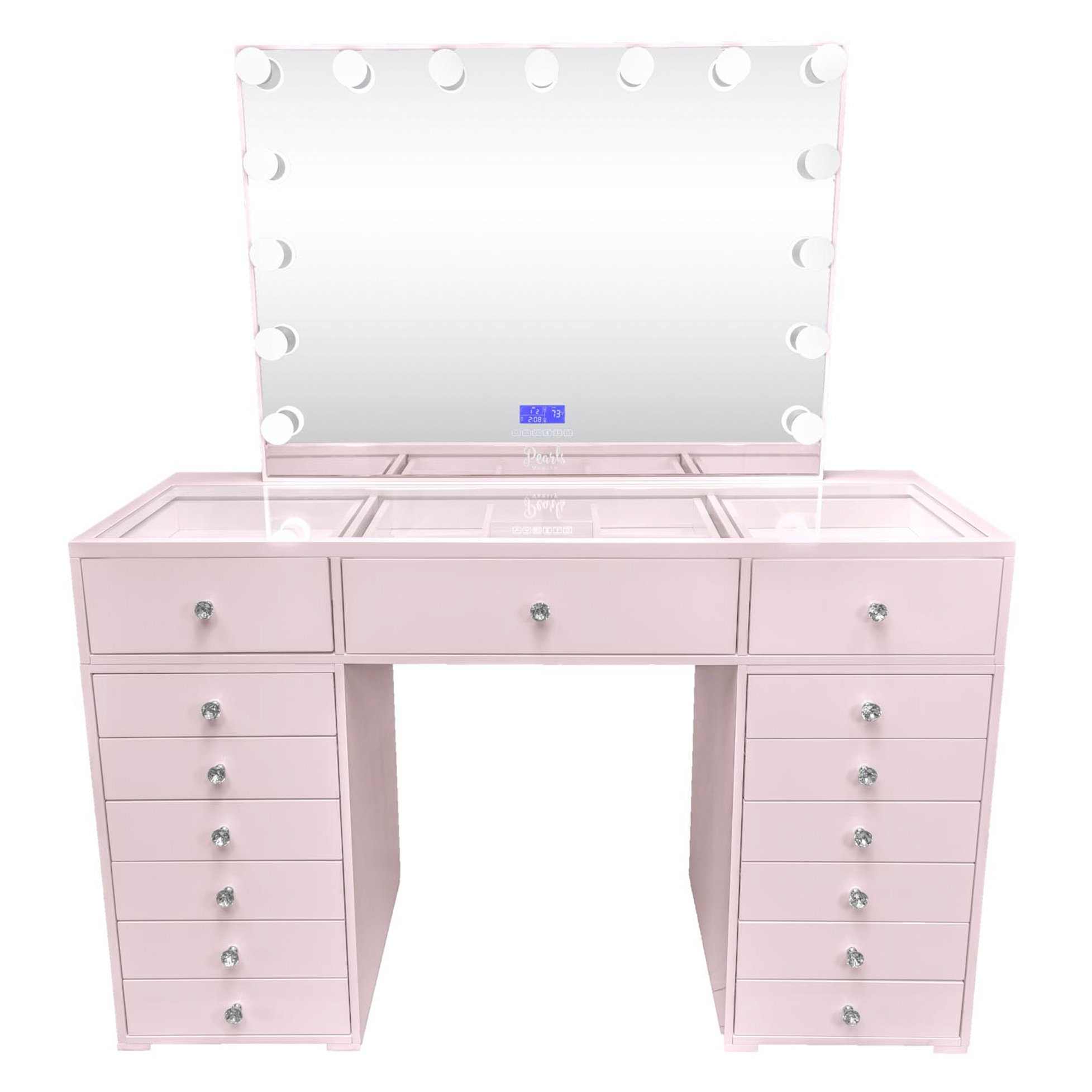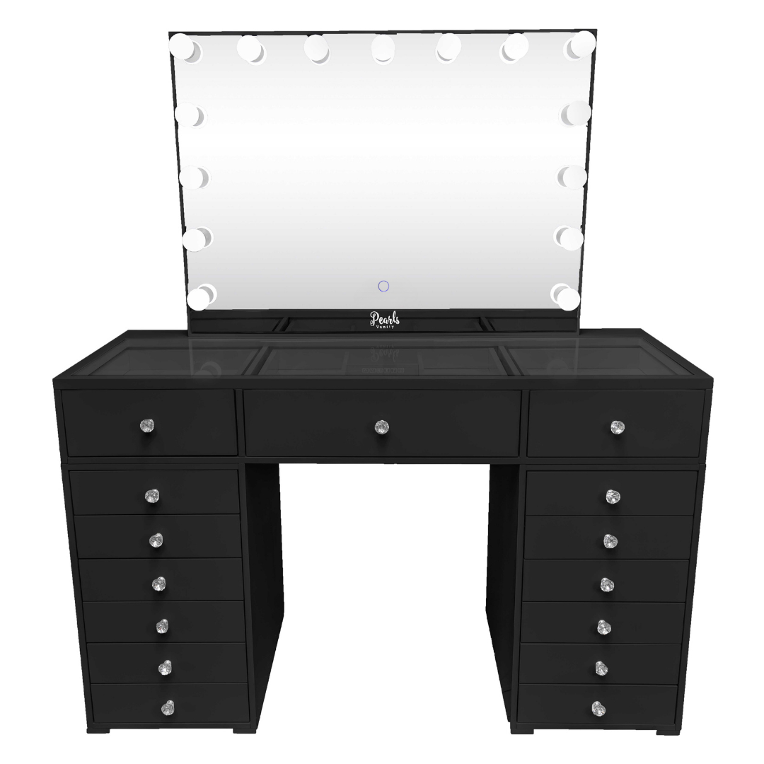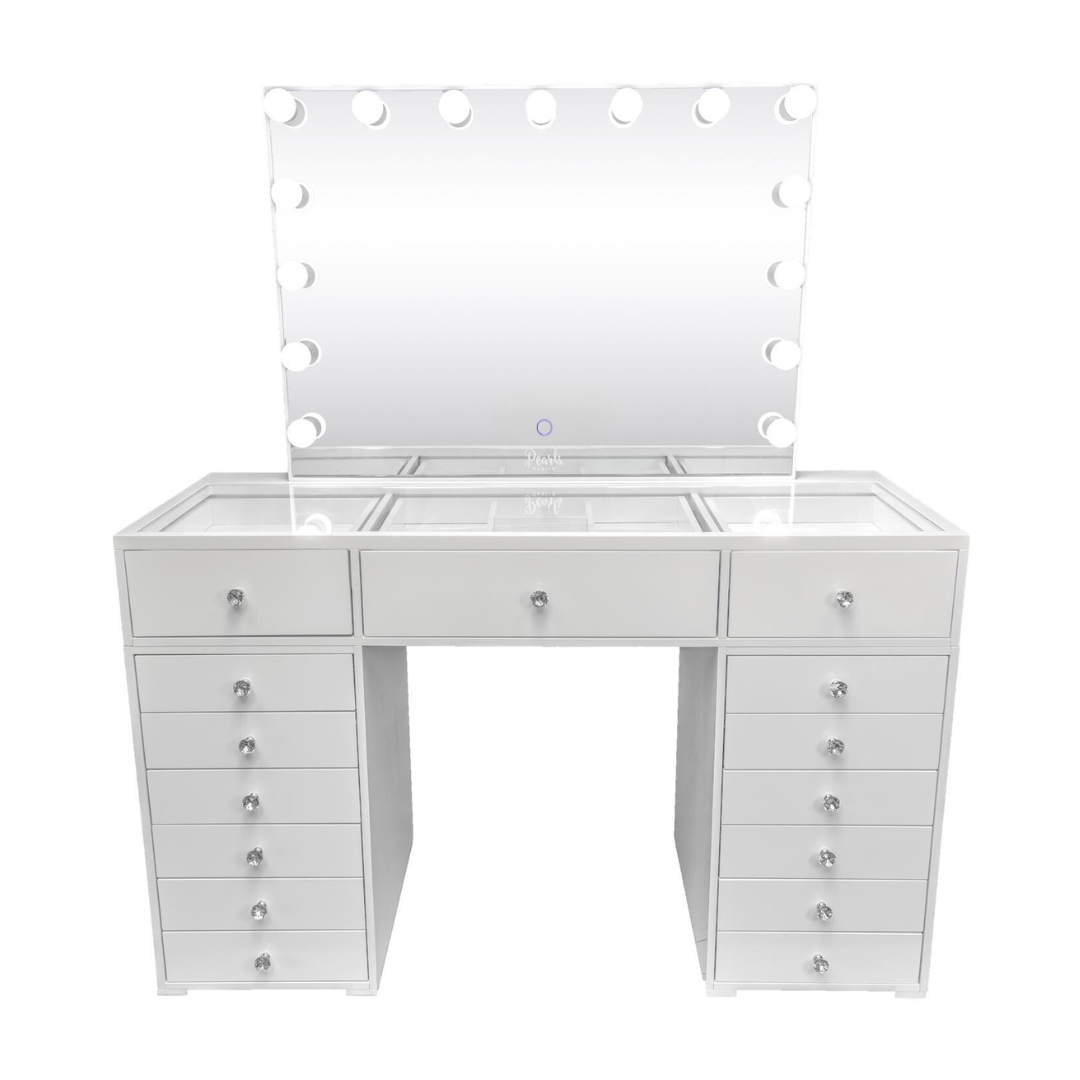This unique and functional vanity is perfectly designed for a QUEEN in need of all the storage she can get! . Temptation Deluxe it’s a serious upgrade to our popular Temptation vanity. 5” added in height allow for a total of 18 compartments bringing you a serious capacity for your large and valuable collection! Temptation Deluxe features three extraordinary double drawers (because three single drawers are not always enough for all your favorite products!) Double drawers are located directly below your tempered glass top allowing you to be able to see through into your most prized possessions, we like to think the bottom drawers are secretive drawers designed just for you to see! In addition to the double drawers Temptation Deluxe comes in with integrated dividers for your two center and larger drawers for a more precise organizational approach. Dividers can be removed if needed to. Temptation Deluxe Vanity’s incredibly resistant tempered glass top provides an extra protection against scratches and stains. All over High-gloss coated surface added for a shinier and sleek look while allowing for an easier wipe-off process. Temptation Deluxe Vanity comes with a phenomenal capacity for all your make up collection, Not to mention, the absolute touch of glamour the crystal knobs bring each of its 15 drawers. Very Sturdy and selective high quality materials, striving to keep your vanity looking beautiful for many years.