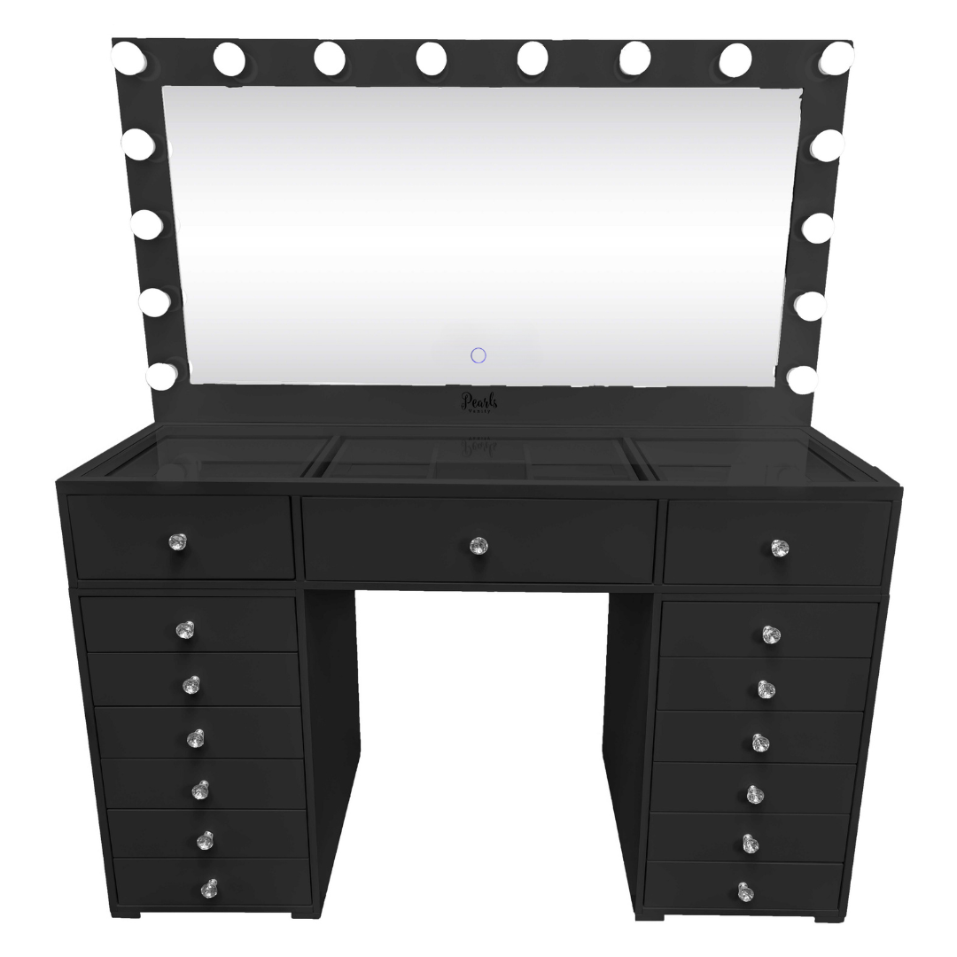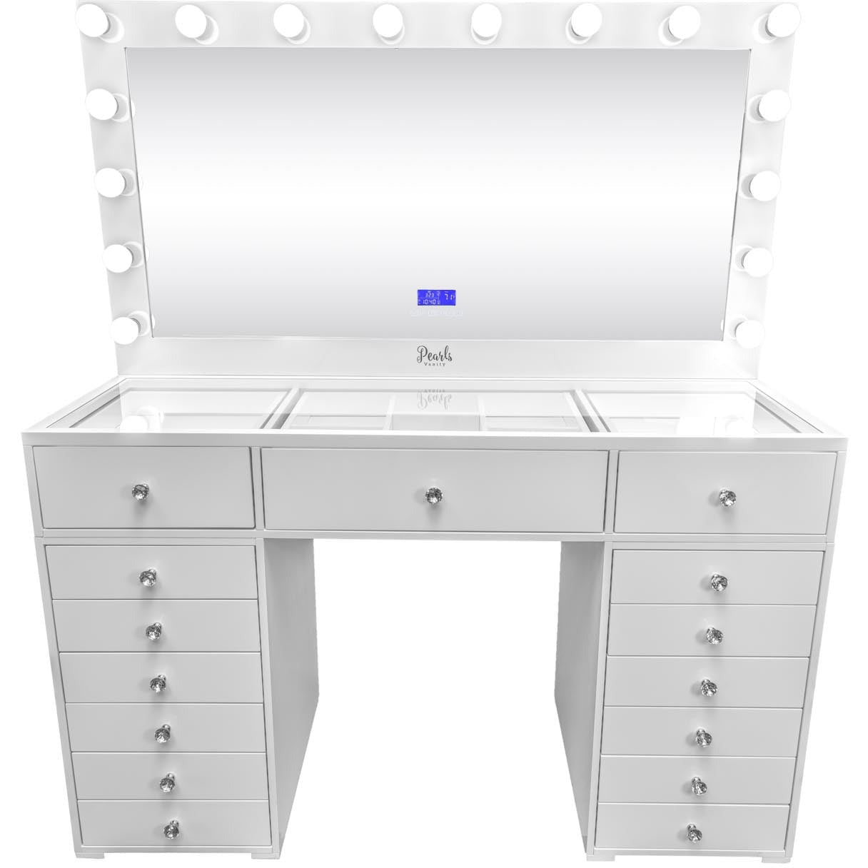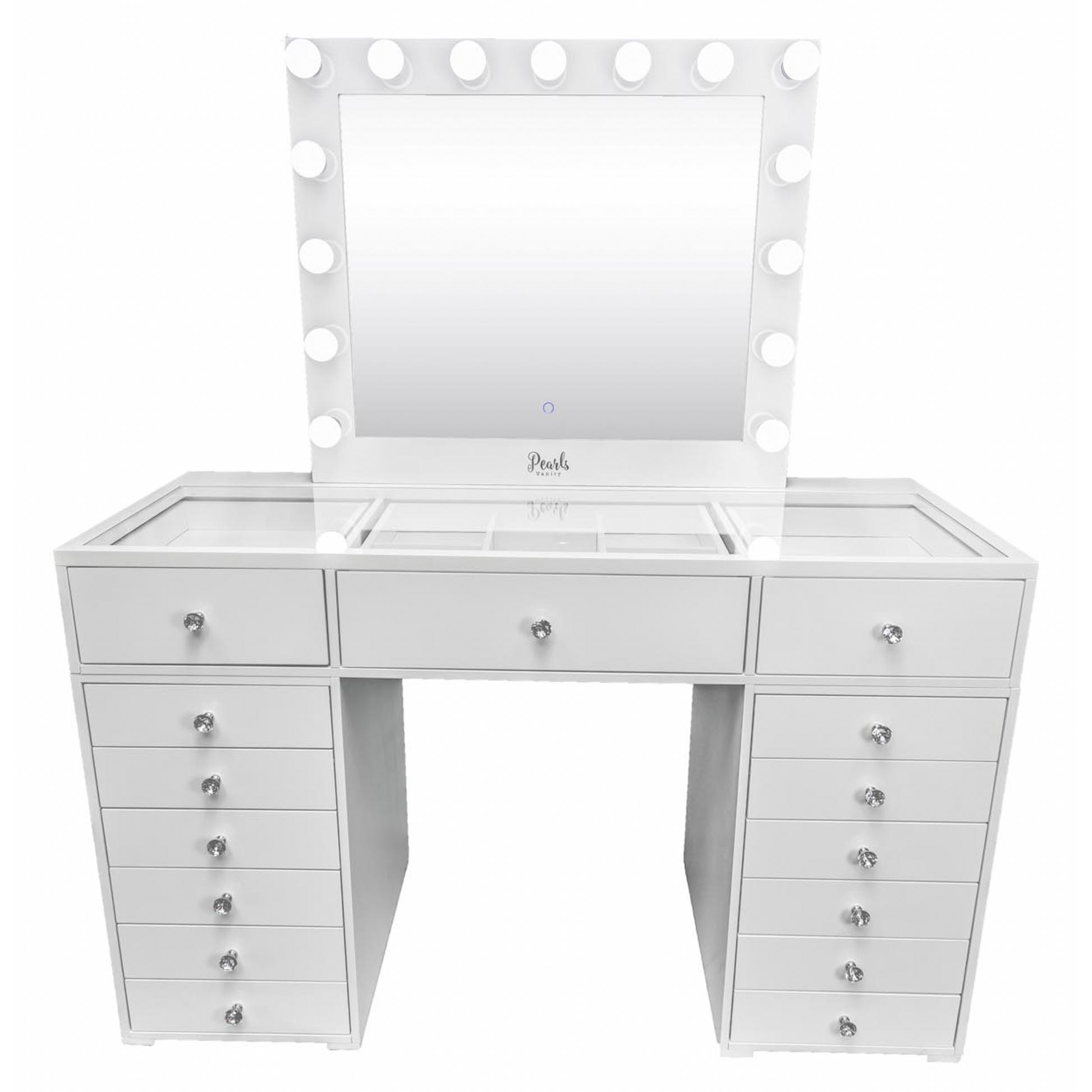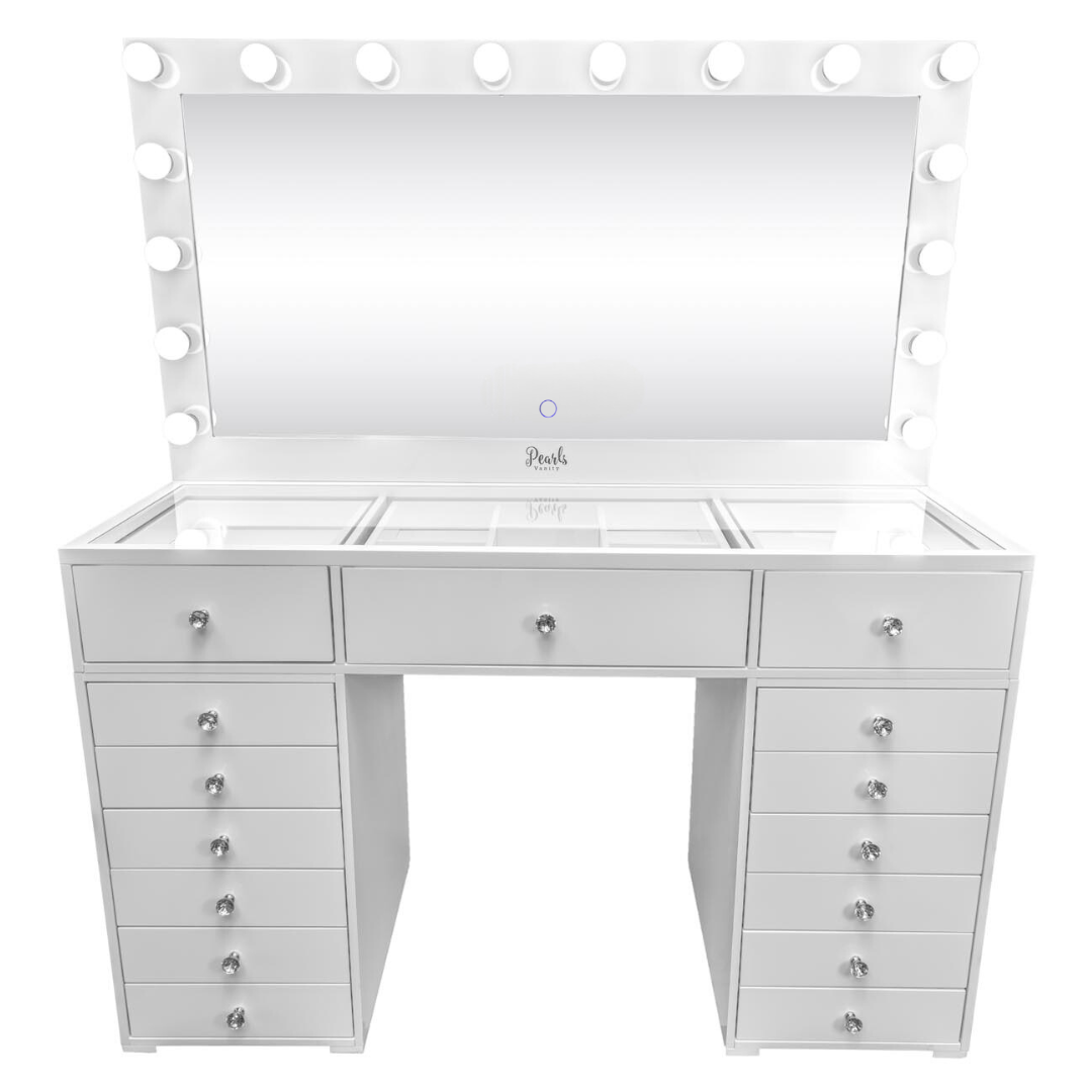 This unique and functional vanity is perfectly designed for a QUEEN in need of all the storage she can get! . Temptation Deluxe it’s a serious upgrade to our popular Temptation vanity. 5” added in height allow for a total of 18 compartments bringing you a serious capacity for your large and valuable collection! Temptation Deluxe features three extraordinary double drawers (because three single drawers are not always enough for all your favorite products!) Double drawers are located directly below your tempered glass top allowing you to be able to see through into your most prized possessions, we like to think the bottom drawers are secretive drawers designed just for you to see! In addition to the double drawers Temptation Deluxe comes in with integrated dividers for your two center and larger drawers for a more precise organizational approach. Dividers can be removed if needed to. Temptation Deluxe Vanity’s incredibly resistant tempered glass top provides an extra protection against scratches and stains. All over High-gloss coated surface added for a shinier and sleek look while allowing for an easier wipe-off process. Temptation Deluxe Vanity comes with a phenomenal capacity for all your make up collection, Not to mention, the absolute touch of glamour the crystal knobs bring each of its 15 drawers. Very Sturdy and selective high quality materials, striving to keep your vanity looking beautiful for many years.