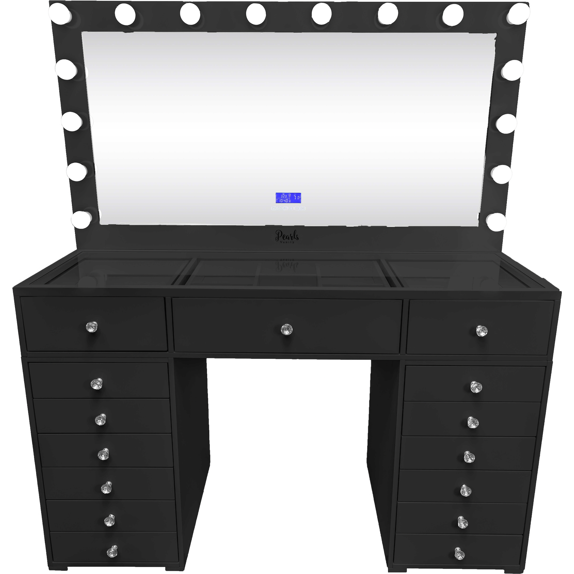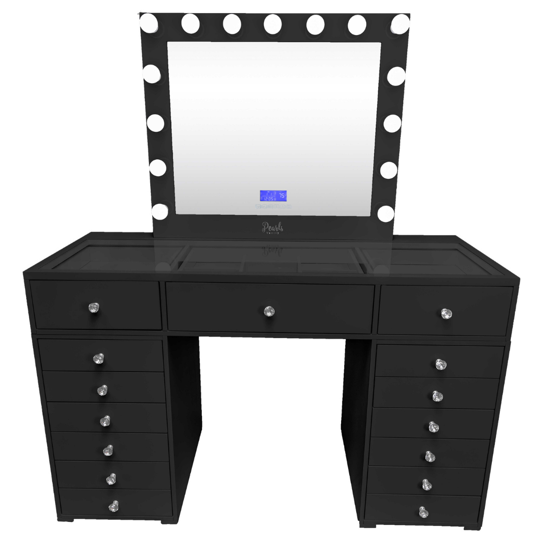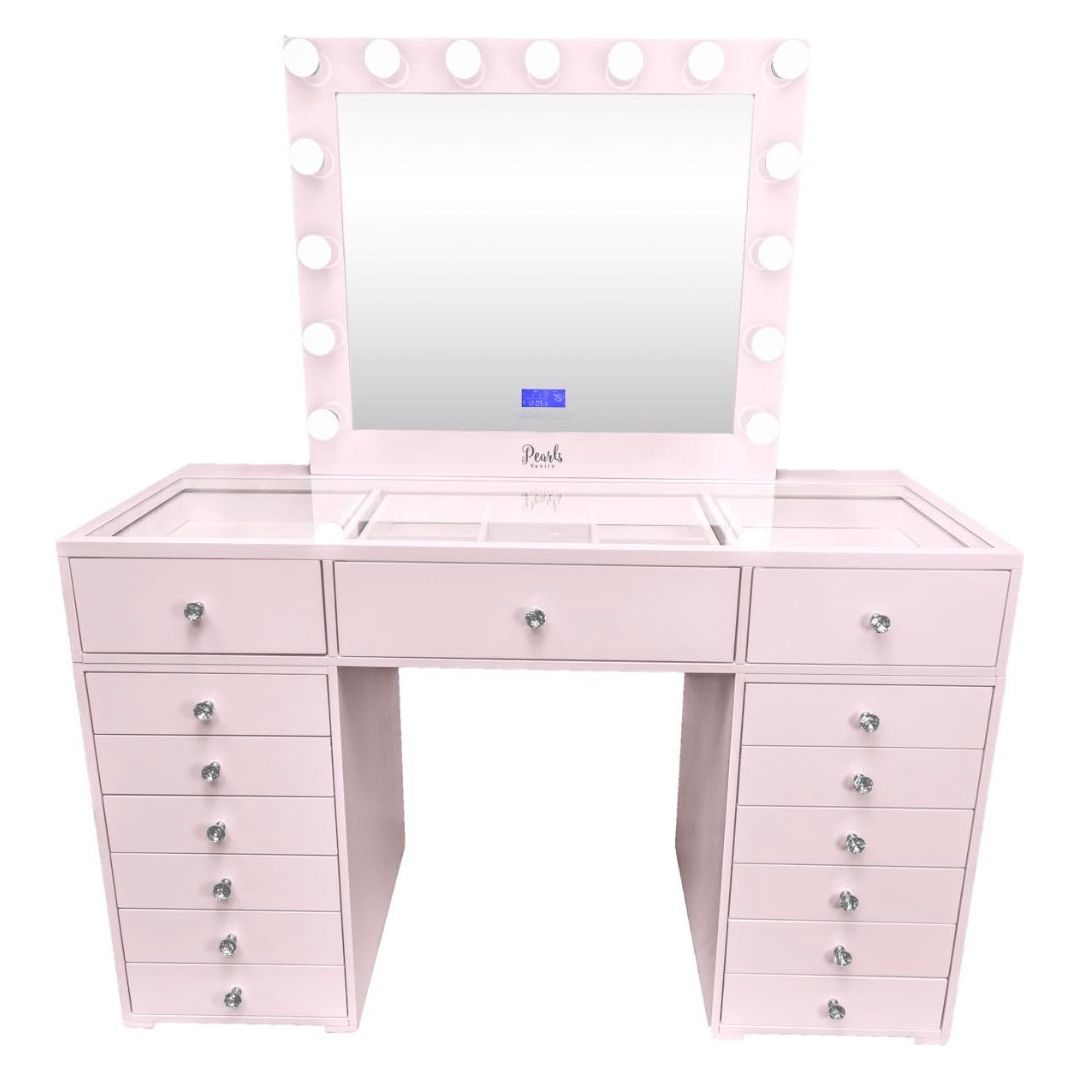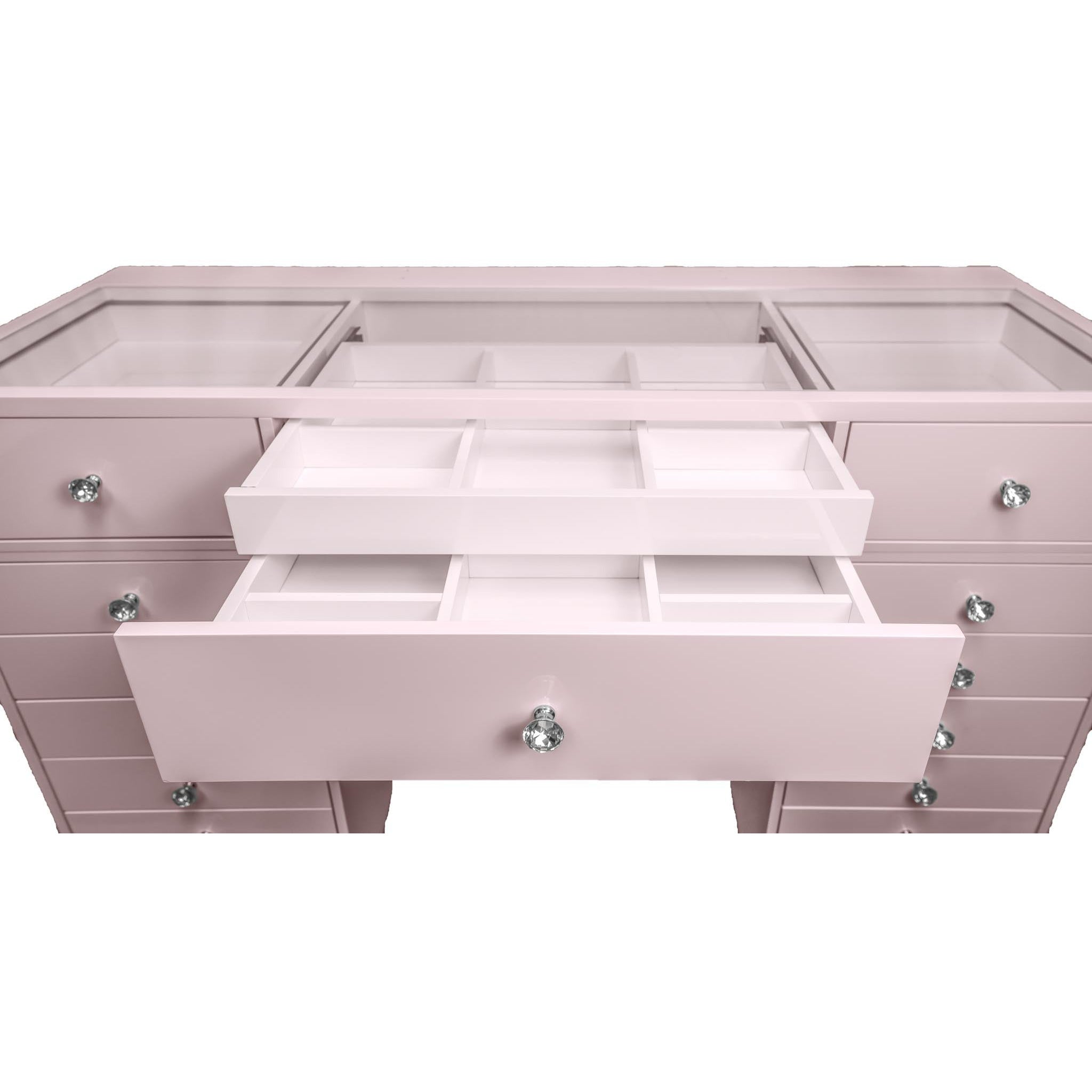 This unique and functional vanity is perfectly designed for a QUEEN in need of all the storage she can get! . Temptation Deluxe it’s a serious upgrade to our popular Temptation vanity. 5” added in height allow for a total of 18 compartments bringing you a serious capacity for your large and valuable collection! Temptation Deluxe features three extraordinary double drawers (because three single drawers are not always enough for all your favorite products!) Double drawers are located directly below your tempered glass top allowing you to be able to see through into your most prized possessions, we like to think the bottom drawers are secretive drawers designed just for you to see! In addition to the double drawers Temptation Deluxe comes in with integrated dividers for your two center and larger drawers for a more precise organizational approach. Dividers can be removed if needed to. Temptation Deluxe Vanity’s incredibly resistant tempered glass top provides an extra protection against scratches and stains. All over High-gloss coated surface added for a shinier and sleek look while allowing for an easier wipe-off process. Temptation Deluxe Vanity comes with a phenomenal capacity for all your make up collection, Not to mention, the absolute touch of glamour the crystal knobs bring each of its 15 drawers. Very Sturdy and selective high quality materials, striving to keep your vanity looking beautiful for many years.